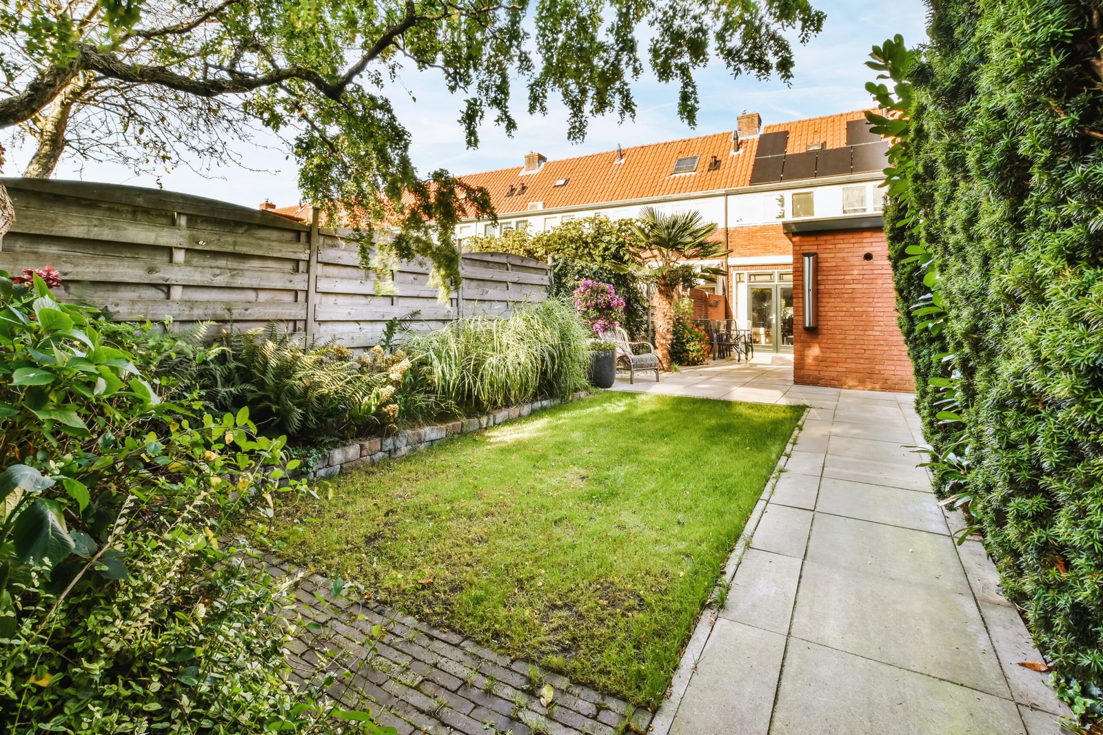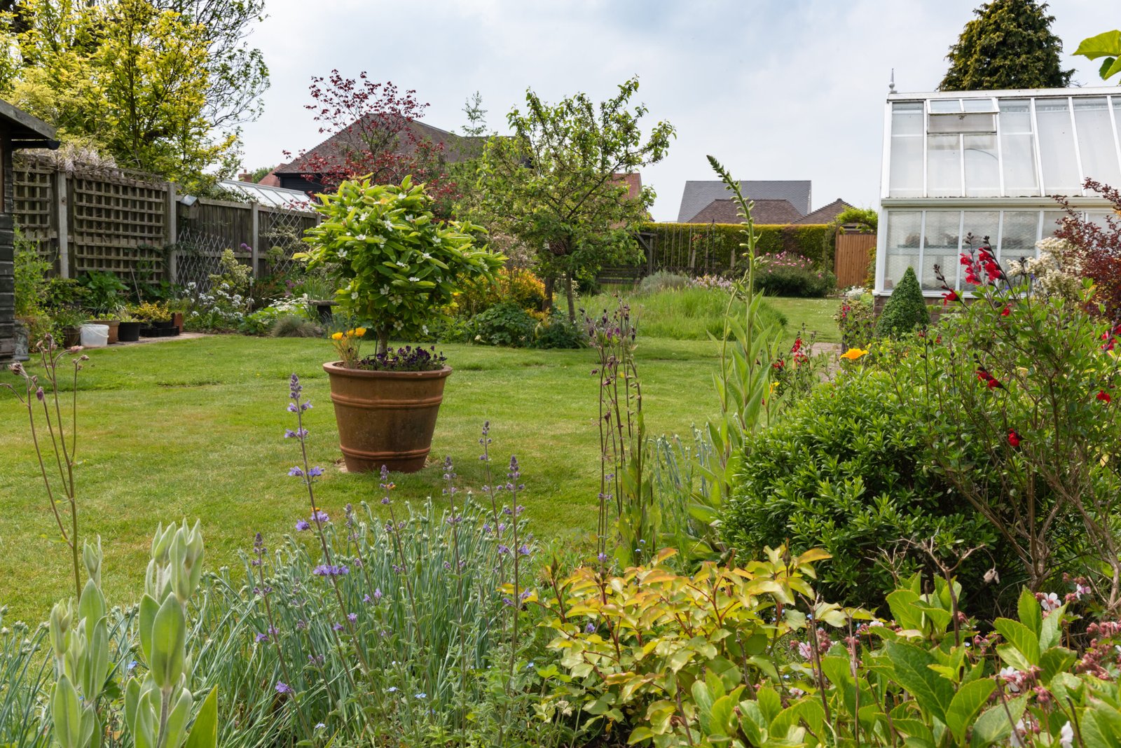 Colorful bunting in gardenan-english-back-garden-full-of-plants-2026-01-09-13-10-42-utc